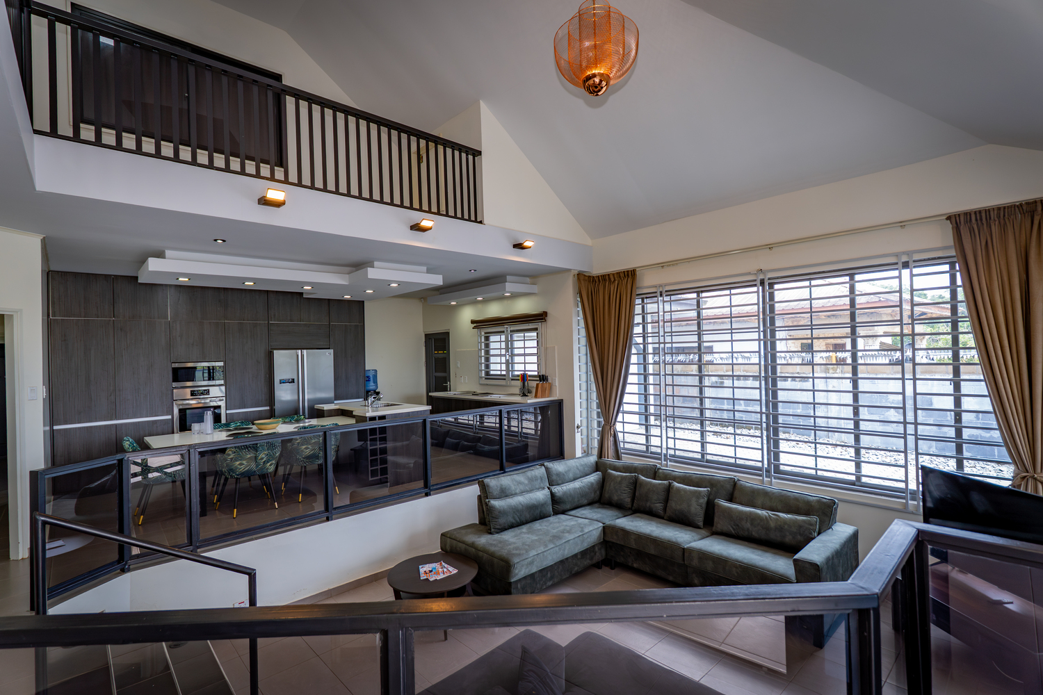 Stap binnen in deze moderne en ruime nieuwbouwwoning (2022) in Paramaribo, waar comfort, licht en een stijlvolle afwerking samenkomen. Zodra je binnenkomt, valt direct de indrukwekkende hoogte van de woonkamer op. De vide en grote raampartijen zorgen voor een open en luchtige sfeer, terwijl de warme tinten en zachte meubels een gevoel van rust en thuiskomen creëren.