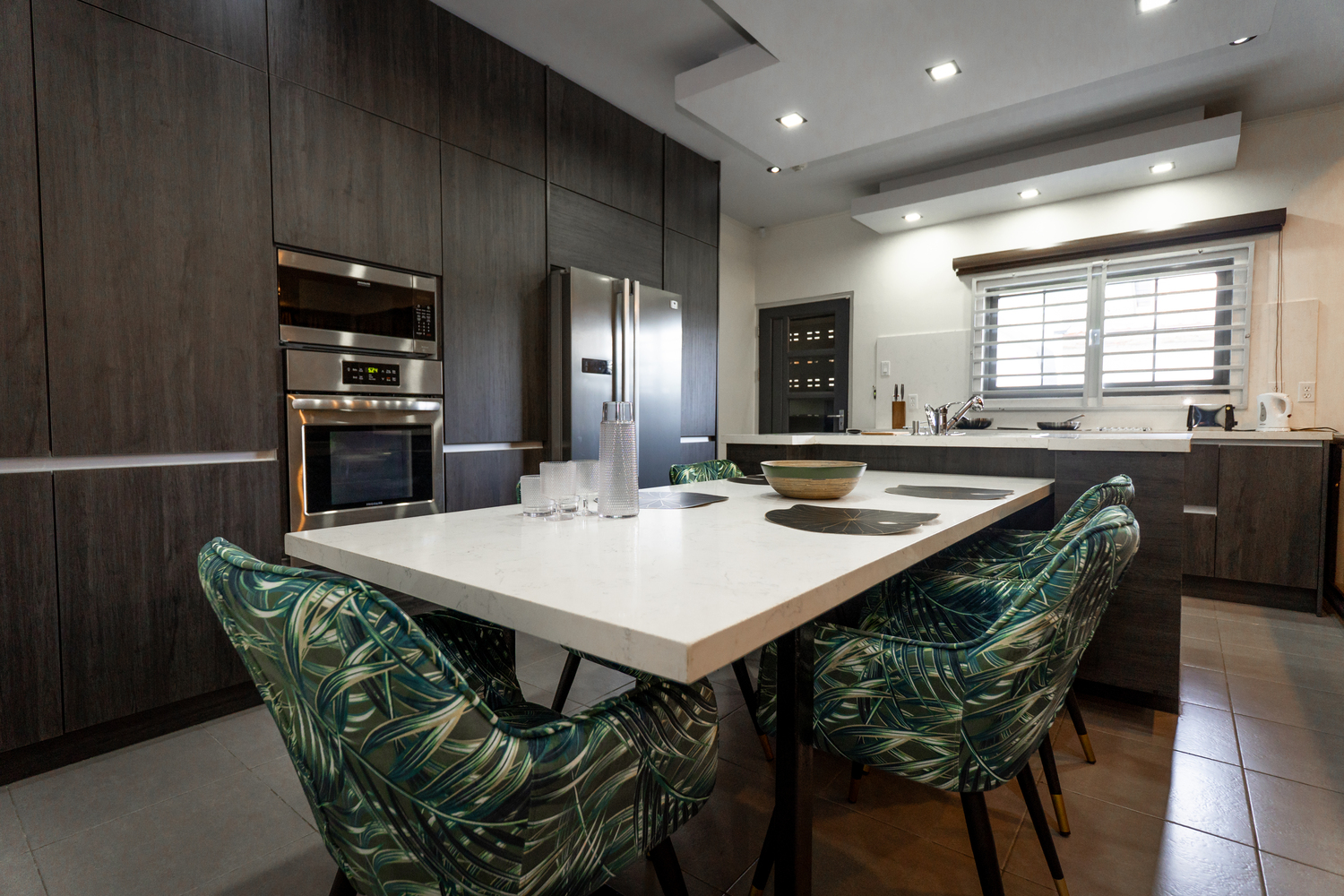 Binnen is alles gericht op comfort en gebruiksgemak. De keuken is volledig uitgerust met een oven, combimagnetron, vaatwasser en elektrische kookplaat. Ook is er een wasmachine aanwezig. De woning beschikt over zowel 110V als 220V stopcontacten.